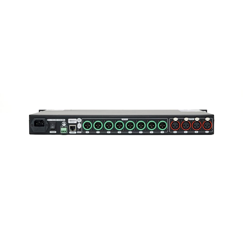 Mặt trước bố trí các nút và màn hình điều khiển trực quan, mặt sau trang bị 4 đầu vào XLR và 8 đầu ra XLR — bố cục tối ưu cho việc kết nối nhiều đường tín hiệu. CS48 thể hiện rõ tính của một bộ chia tần chủ động hiện đại: vừa là crossover analog trong giao tiếp vật lý, vừa là crossover digital nhờ cấu trúc AD/DA cao cấp (ADC 32-bit & DAC 24-bit). Tốc độ lấy mẫu 48 kHz và trở kháng đầu vào 10 kΩ giúp thiết bị tương thích tốt với hầu hết mixer, preamp và các nguồn tín hiệu chuyên nghiệp.